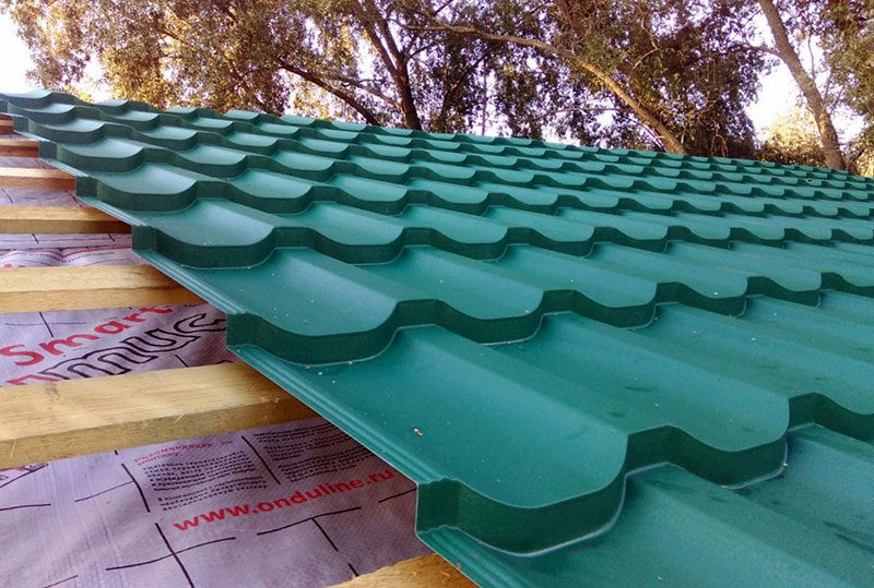 - Одной из особенностей металлочерепицы является конденсирование влаги. Для ее отведения понадобится гидроизоляционная пленка.