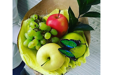 В формировании такого необычного букета используются шелковые ленты и бантики, органза различных цветов, бижутерия, стразы и кружево. Букет может быть дополнен восхитительной открыткой в виде сердца с вашими искренними пожеланиями. Фруктовый букетБукет из фруктов будет не только красив, но и весьма практичен и полезен. Ведь вместо традиционных цветов здесь используются фрукты, ягоды и овощи, которые потом можно съесть. Часто это фасоль, чеснок, перец чили, яблоки, клубника, бананы, персики, ананасы, киви, виноград, апельсины. В качестве декора можно использовать листья салата, перья зеленого лука, веточки розмарина, шоколадную глазурь или разноцветные фигурки из теста. Чтобы создать фруктовый букет, не нужно быть флористом. Здесь не работает «язык цветов», который берут во внимание, составляя букеты из традиционных цветов. В этом процессе главное – изобретательность, выдумка и фантазия. Красиво смотрится букет из фруктов и цветов. Здесь уместно использовать цветы, устойчивые к увяданию - например, хризантемы, гвоздики, эустомы. Пусть наши идеи букетов помогут вам сделать День Святого Валентина ярким и запоминающимся для вашей любимой. |