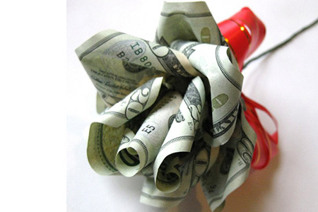 Как видите, набор инструментов и материалов невелик. Остается только позаботиться о приобретении всего необходимого заранее. Создать можно любые цветы – розы, тюльпаны, крокусы, ромашки. В центре бутона будет размещаться конфета, окруженная лепестками цветка, выполненного из гофрированной бумаги. Готовые «цветы» оформляются в виде букета или помещаются в красивую корзинку. Можно также подарить букет из конфет в коробке вместе с любимым напитком дамы или мягкой игрушкой, оформив презент красной атласной лентой. Такие букеты из конфет на 14 февраля очень популярны среди представительниц прекрасного пола. Ведь это оригинальный подарок, который, к тому же, вкусный и невероятно красивый. Букет из денегЕще один оригинальный подарок - букет из денег. Такой презент становится все более популярным. Ведь вы подарите и цветы, и деньги, чем безумно удивите и порадуете даму. Кстати, совсем необязательно для изготовления такого букета использовать настоящие денежные купюры. Букет из денег можно сделать из копий купюр, распечатанных на принтере. Хотя это уже будет совсем не тот эффект. Мастера предлагают разные идеи создания букетов из денег. Это могут быть смешанные букеты, где денежные цветы комбинируются с настоящими, либо монобукеты, выполненные только из купюр. Выбирать вам. В любом случае, пора становиться мастером на все руки и приступать к созданию композиции. Обратите внимание, что при создании букета денежная купюра должна быть новая. Тогда цветы получаются особенно красивыми и аккуратными. Также понадобятся: - шпажки для создания стебля;