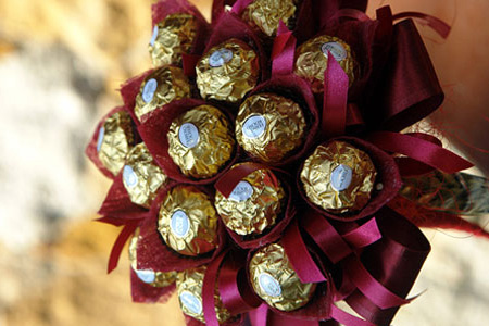 Возможно, одна из этих идей придется вам по вкусу, и вы воспользуетесь ею. Этот праздник уверенно вошел в нашу жизнь, и теперь его с удовольствием отмечают влюбленные пары. Традиционно на День всех влюбленных мужчины дарят своим любимым цветы. Красивый букет на День Валентина может состоять из различных цветов. Это могут быть монобукеты или композиции, оформленные декором из сердечек и бабочек. Опытные флористы предлагают составить оригинальные букеты, которые имеют интересные формы – например, в виде сердца, шара или полушара. Флористы утверждают, что цветы на День Валентина – это прекрасная возможность рассказать о своих чувствах любимой, используя «язык цветов». Например, красная роза поможет мужчине выразить свою искреннюю любовь, страсть и надежду на взаимность, а с помощью ярких гербер любимый может сделать комплимент и поделиться своим хорошим настроением. Пусть ваше сердце подскажет, что подарить девушке на 14 февраля. Однако, совсем необязательно преподносить цветочный презент. Есть много вариантов и необычных идей, благодаря которым ваш подарок будет выглядеть просто сногсшибательно. Вот некоторые из них. Букет из конфетОригинально и необычно смотрится букет из конфет. Выглядит он весьма забавно – каждая конфета заворачивается в цветную бумагу, создавая бутон цветка или ягоду. Такой подарок вы можете сделать своими руками, просмотрев мастер-класс, который легко найти в Интернете. Вашей любимой будет намного приятнее получить такой «сладкий» букет, особенно, если вы его сделали самостоятельно. Изготовление такого букета потребует мало времени и материалов. Но для начала продумайте, какие цветы или ягоды вы будете делать. Для такого «сладкого» подарка нужны: - гофрированная бумага тех цветов, которые лучше всего позволят воссоздать идею композиции;