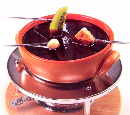 Фондю шоколадноеСостав: 350 гр. шоколадной стружки, 40 гр. сухого молока, 120 гр. воды, 1 ч. ложка ванилин. Приготовление: Шоколад положите в фондюшницу. Молоко взбейте с кипятком и влейте в фондюшницу. Добавьте в фондю ванилин и нагревайте при постоянном помешивании до расплавления шоколада и загустения фондю. Уменьшите огонь. Подавайте к шоколадному фондю бисквит, нарезанный кубиками, свежие мягкие фрукты, а также грецкие или бразильские орехи. Фондю с шампанским