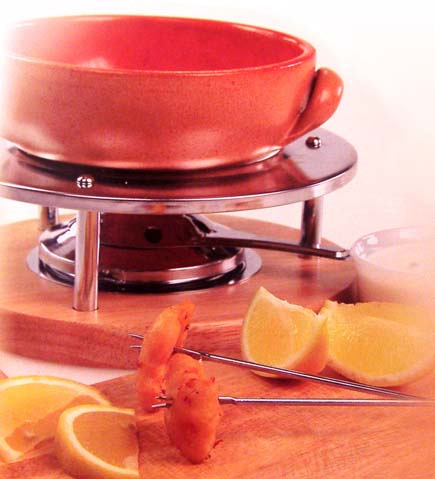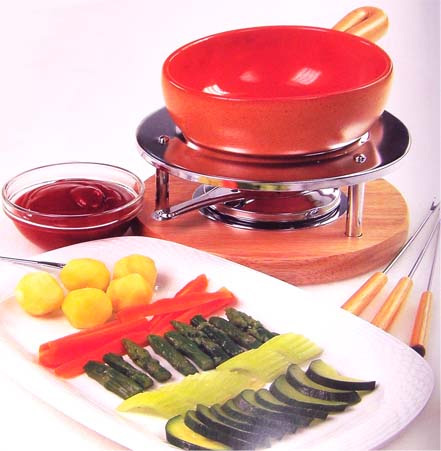 Состав: 100 гр. брокколи, 100 гр. цветной капусты, 100 гр. брюссельской капусты, 100 гр. кольраби, (для соуса) 3 ч. ложки порошка карри, 150 гр. густых сливок, 3 ст. ложки лимонного сока, 150 гр. сметаны, 150 гр. яблочного мусса, сахар, соль, черный перец, 1,5 л овощного бульона.Приготовление: Отварите овощи в подсоленной воде до полуготовности, откиньте на дуршлаг и обсушите на бумажных полотенцах. смешайте карри с 3 ст. ложками сливок, добавьте остальные ингридиенты для сосуа, взбейте оставшиеся сливки и подмешайте их к яблочному соусу. Перелейте соус в пиалу. Разогрейте бульон в фондюшнице до кипения, накалывайте капусту на вилку, разогревайте в бульоне и ешьте с яблочным соусом. Фондю "овощной букет"