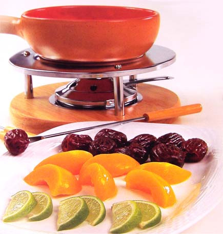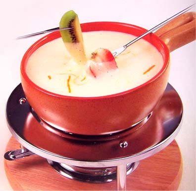 Состав: 3 яйца, 50 гр. мелкого сахара, 2 ст. ложки тертой апельсиновой цедры, 150 гр. густых сливок, 150 гр. шампанского, 150 гр. нежирных сливок. Приготовление: Перемешайте сахар с яами и цедрой, поставьте на водяную баню и взбивайте до тех пор пока смесь не станет густой и пенистой. Снимите смесь с бани, вбейте в нее густы сливки, влейте шампанское и нежирные сливки и тщательно взбейте. Перелейте в фондюшницу и подавайте с клубникой или другими мягкими фруктами. Фондю с абрикосами