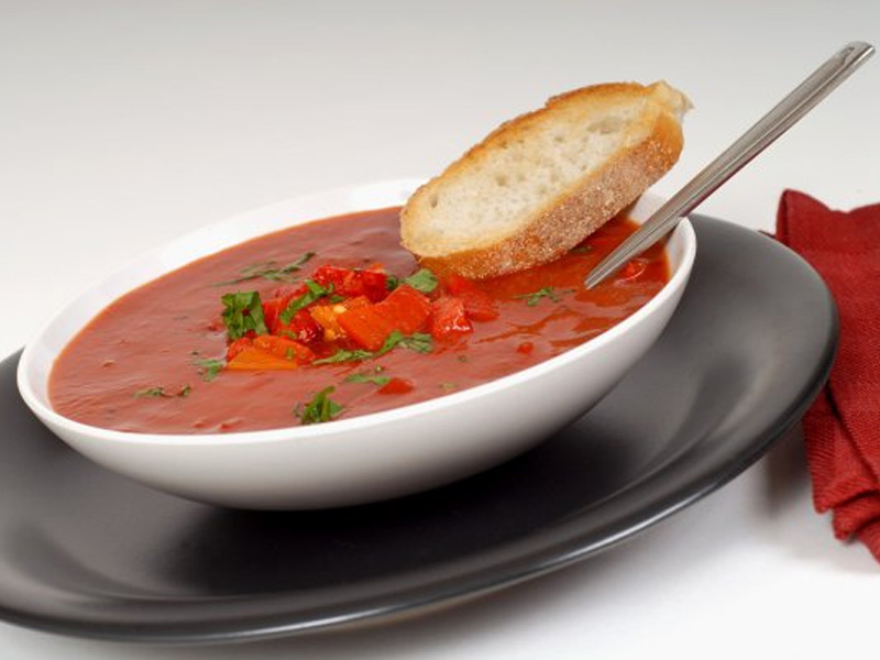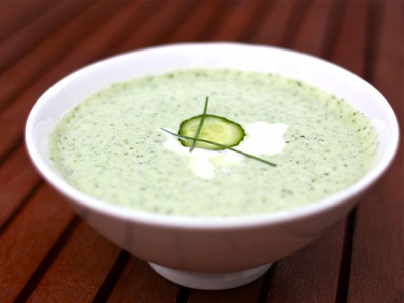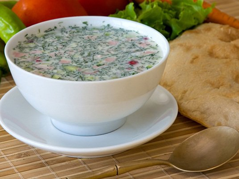 1. Окрошка на кефире и газированной воде Ингредиенты: 4 картофеля, 4 яйца, 5 огурцов, 150 г салями, 220 г редиса, 2 пучка зеленого лука, 1 пучок укропа, 1 л кефира, 900 мл газированной воды, соль, уксус по вкусу, сметана для подачи Приготовление: Сварить картофель, очистить и порезать кубиками. Яйца сварить в крутую, очистить и измельчить. Огурцы мелко порезать, 1 огурец и редис потереть на терке. Салями порезать кубиками. Лук мелко порезать, часть посыпать солью и потолочь. Сложить все ингредиенты в большую кастрюлю. Налить холодный кефир. Добавить холодную газированную воду. Посолить. Добавить уксус по вкусу. Перемешать. Остудить. 2. Окрошка на квасе Ингредиенты: 300 г зеленого лука, 4-5 куриных яиц, 0,5 ч. л. горчицы, 1,5 л кваса, 500 г огурцов, 300 г вареного мяса или колбасы, 300 г картофеля, 1 ч. л. хрена, 100 г укропа, соль, лимонный сок, перья чеснока, петрушка – по вкусу Приготовление: Сварить яйца вкрутую, картофель - в мундире. Зеленый лук измельчить. Из вареных яиц вынуть желтки и добавить к луку, заправить горчицей. Растереть все пестиком: лук должен стать мягким, а желтки и горчица – превратиться в однородную массу. 3алить все квасом. Порезать и добавить в окрошку укроп. Можно добавить перья чеснока и петрушку. Почистить вареный картофель, нарезать кубиками и добавить в общую массу. Огурцы можно почистить (если кожица жесткая или горчит), порезать кубиками. Оставшийся от яиц белок, а также мясо (или колбасу) тоже нарезать кубиками. Все ингредиенты положить в окрошку. Добавить лимонный сок. Посолить по вкусу, добавить хрен. По необходимости долить квас. Перед подачей окрошку нужно остудить в холодильнике. 3. Гаспачо Ингредиенты: 5-6 очень спелых помидоров, 2 сладких перца, 2 зубчика чеснока, пара засохших кусочков белого хлеба, 2 стакана томатного сока, 2 ст. л. красного винного уксуса, 2 ст. л. оливкового масла, ½ очищенного свежего огурца, 1 репчатая луковица, 3 веточки петрушки, соль, перец по вкусу, 3 капли соуса табаско, лед Приготовление: промыть овощи под проточной водой, бланшировать помидоры, удалить шкурку и семена. Все ингредиенты, кроме помидоров, измельчить с помощью блендера в глиняном горшке. Помидоры перетереть на терке, добавить к смеси, размешать ложкой и подавать со льдом. 4. Свекольник на кефире Ингредиенты: 350 г огурцов, 1 л кефира, 30 г зеленого лука, 350 г свеклы, 30 г укропа, 2 дольки чеснока, соль, перец по вкусу Приготовление: Натереть огурец на крупной терке. Если кожица горчит, предварительно ее удалить. Сырую молодую свеклу очистить и натереть на мелкой терке. Сложить огурцы и свеклу в большую миску или кастрюлю, добавить кефир и мелко нарезанную зелень. Посолить и положить очень мелко нарезанный чеснок. Хорошо перемешать, добавить немного холодной воды, проверить на соль и подавать, посыпав зеленью. 5. Холодный огуречный суп Ингредиенты: 600 мл кефира, 2 огурца, 4 шт. редиса, 1 долька чеснока, свежая зелень, сахар, соль и молотый перец - по вкусу Приготовление: Все овощи и зелень помыть. Огурец и редис очень мелко нарезать или натереть на терке. Очищенный чеснок пропустить через пресс, зелень измельчить. Овощи и зелень залить кефиром, добавить сахар, посолить и поперчить. Хорошо перемешать и подавать к столу с поджаренным хлебом. |