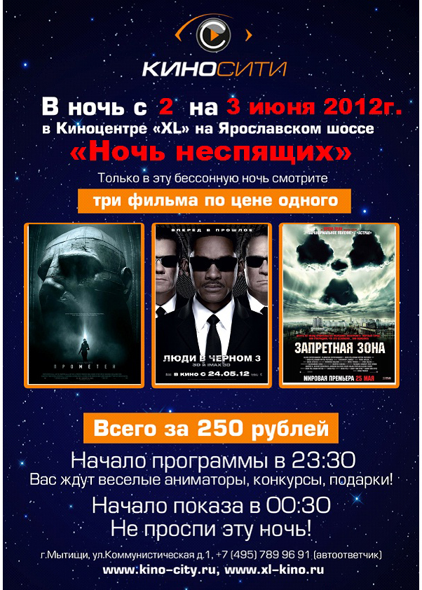 В ночь с 2 на 3 июня 2012г в Киноцентре "XL" на Ярославском шоссе «Ночь неспящих». Три фильма по цене одного. Начало программы в 23:30.