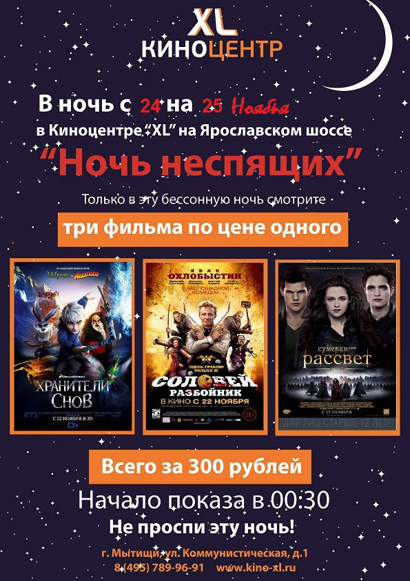 В ночь с 24 на 25 ноября 2012г в Киноцентре "XL" на Ярославском шоссе «Ночь неспящих».