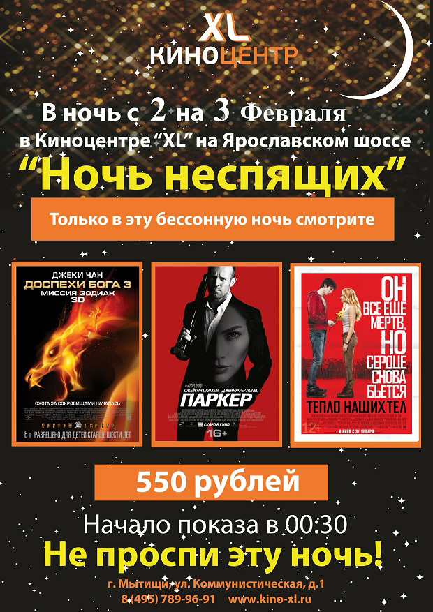 В ночь с 2 на 3 февраля 2013 года в Киноцентре "XL" на Ярославском шоссе «Ночь неспящих». Три фильма «Доспехи Бога: Миссия Зодиак», «Паркер» и «Тепло наших тел» по цене одного. Начало в 00:30.
