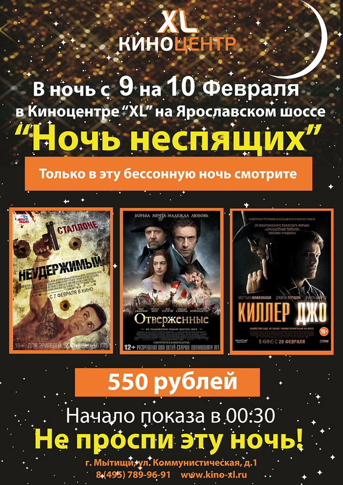 В ночь с 9 на 10 февраля 2013 года в Киноцентре "XL" на Ярославском шоссе «Ночь неспящих». Три фильма «Неудержимый», «Отверженные» и «Киллер Джо» по цене одного. Начало в 00:30.