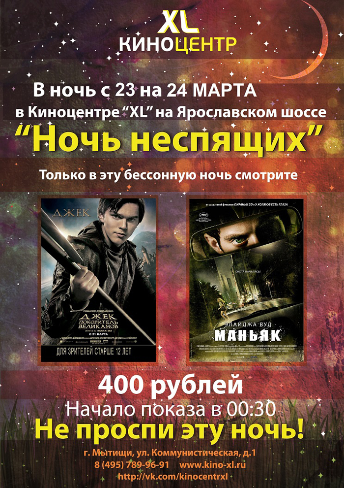 В ночь с 23 на 24 марта 2013 года в Киноцентре "XL" на Ярославском шоссе «Ночь неспящих». Два фильма «Джек - покоритель великанов» и «Маньяк» всего за 400 рублей. Начало в 00:30.