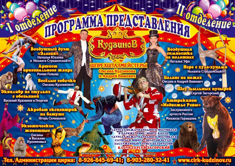 В программе представлены все жанры циркового искусства: воздушные гимнасты и акробат на батутах, артисты оригинального жанра, эквилибристы на стульях с обезьянками, экзотические животные, шоу мыльных пузырей, дрессированные мишки. А веселый клоун Сергей Загорский, лауреат международных конкурсов сатиры и юмора рассмешит и удивит Вас своими шутками и розыгрышами.