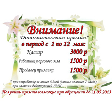 Акции - Студенческий трудовой отрядЗапись на собеседование по тел.: (495) 921 16 13 или ICQ: 414229498 Собеседование проводится по будням (при себе иметь паспорт, карточку ПФР и ручку) график собеседований Дополнинельная премия![]() В период с 1 по 12 мая При отработке не менее 8 дней (смены не менее 7 часов); при наличии действующей ЛМК. Получить премию возможно при обращении до 31.05.2013. В октябре открытие Гиперглобуса в г. Королёв![]() Дневные, вечерние и ночные смены (продолжительностью от 4-ех до 12-ти часов) Сезонное повышение ставок!!!![]() С 27 августа по 9 сентября Акция «Отработай 10 смен в период с 27 августа по 9 сентября». |